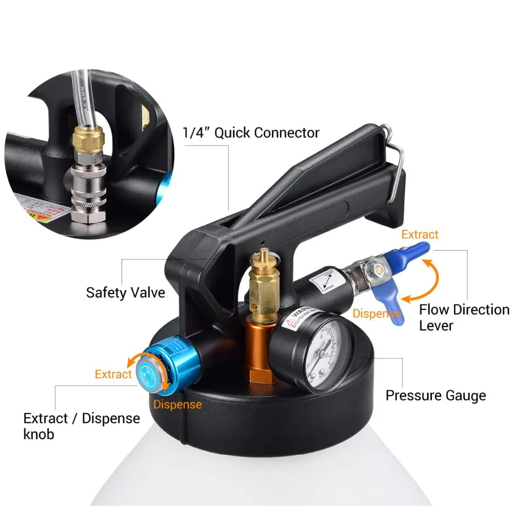 1: Производительность: пневматический экстрактор жидкости предназначен для извлечения и заполнения коробки передач и моторного масла на автомобилях.