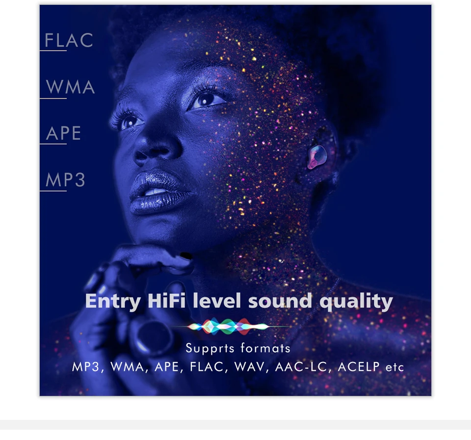 Music player has DSP audio decoding IC, dual DAC decoding for excellent sound reproduction. Equalizer with preset Rock, Pop, Jazz, Classic, Electronic and Custom EQ. Support CUE track decoding and all major hi-fi lossless music format including FLAC, APE, WMA, WAV, ALAC, AIFF, etc.