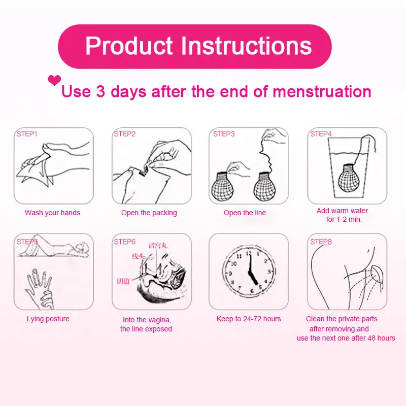 Поместите этот продукт во влагалище, один раз, меняйте каждые 1-2 дня