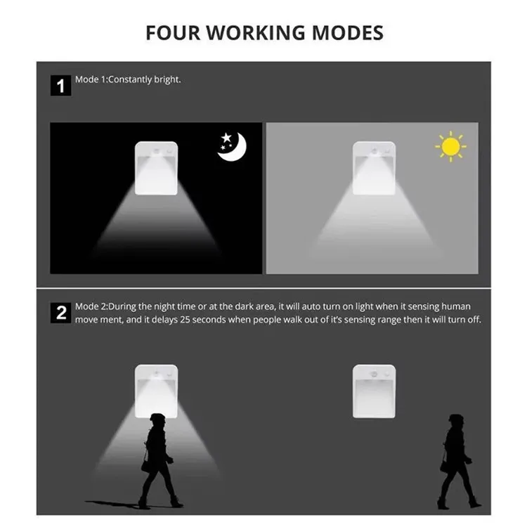 На корпусе лампы есть кнопка Вы можете нажать на него, чтобы изменить режим 1. В течение дня и ночи. 2. Датчик PIR + светильник, режим датчика --- работает только в темноте Мы разместили тестовое видео ниже. Пожалуйста, нажмите здесь, чтобы посмотреть его.