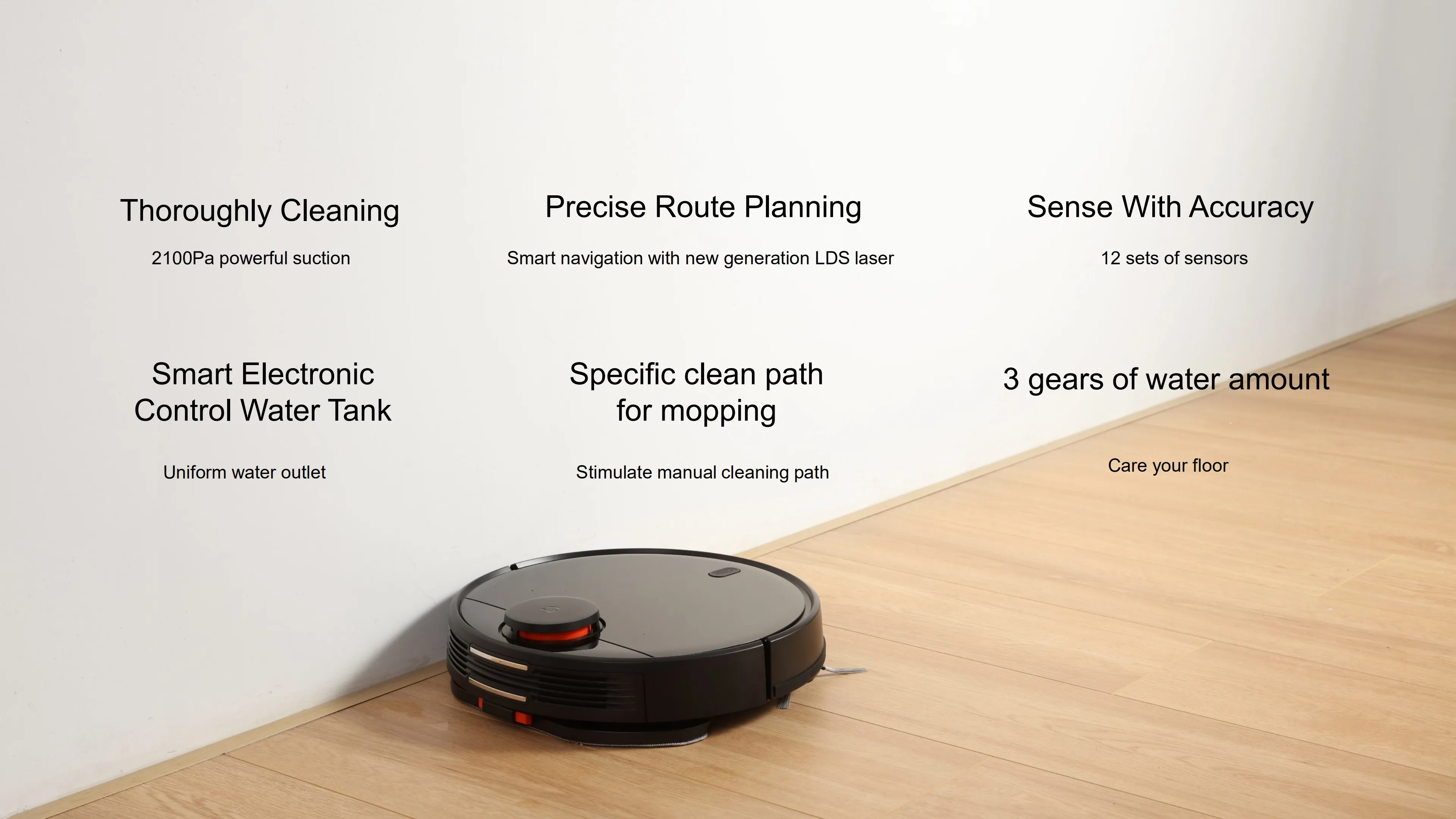 6 Рекомендуемая причина 1. Тщательная очистка 2100 ПА Мощное всасывание 2, Sense с точностью 12 набор датчиков 3, конкретный чистый путь для уборки 4, точное планирование маршрута умная навигация с новым лазером LDS 5, умный электронный резервуар для воды 6, 3 шестерни количества воды Позаботьтесь о своем полу