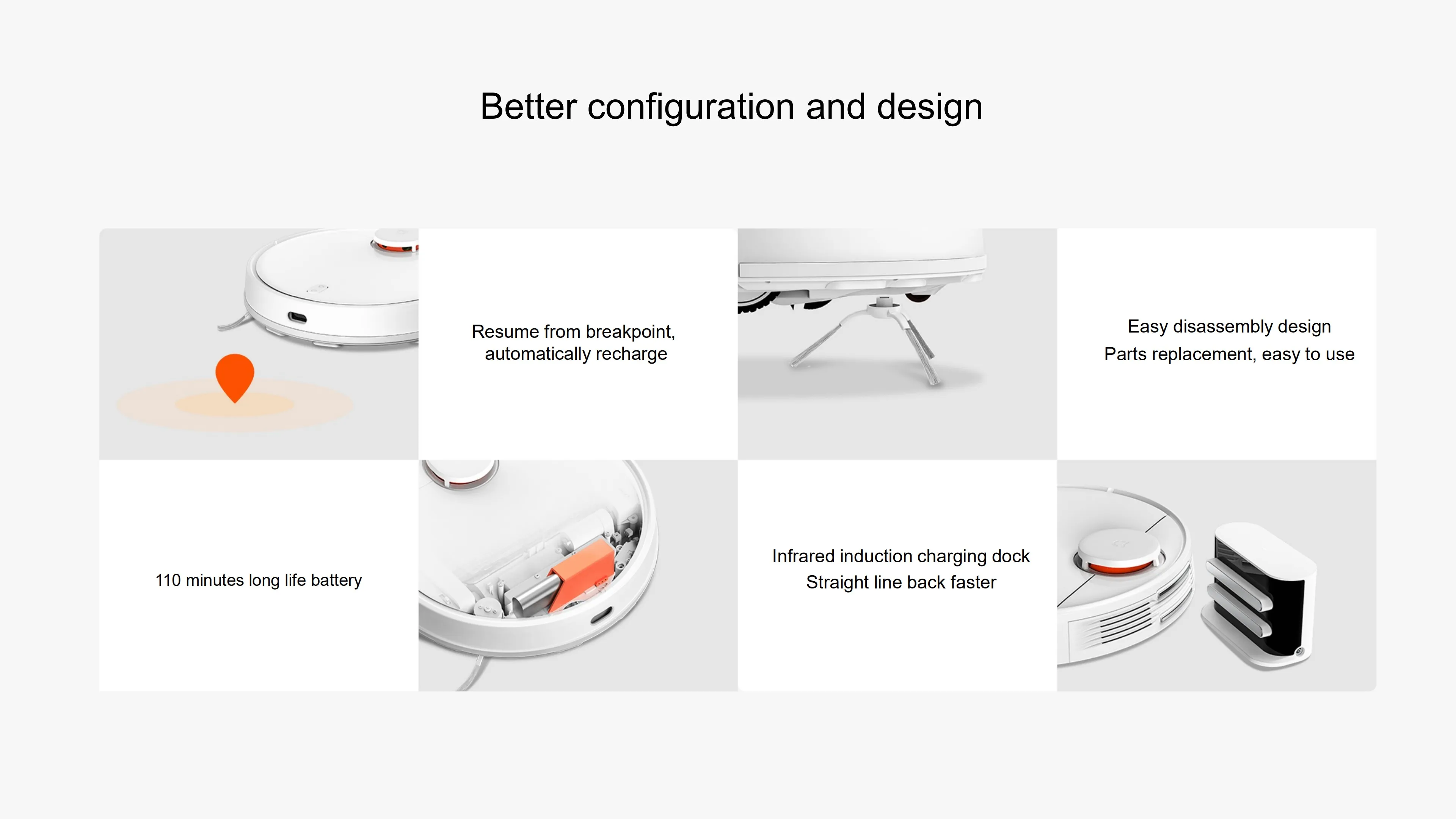 Конфигурация высокой энергии 1. Подметание точки останова 2, 10 мин длительный срок службы батареи развертки комнаты 180m2 3, легко разбирается, легко заменяет детали 4, Подставка для зарядки с инфракрасным датчиком
