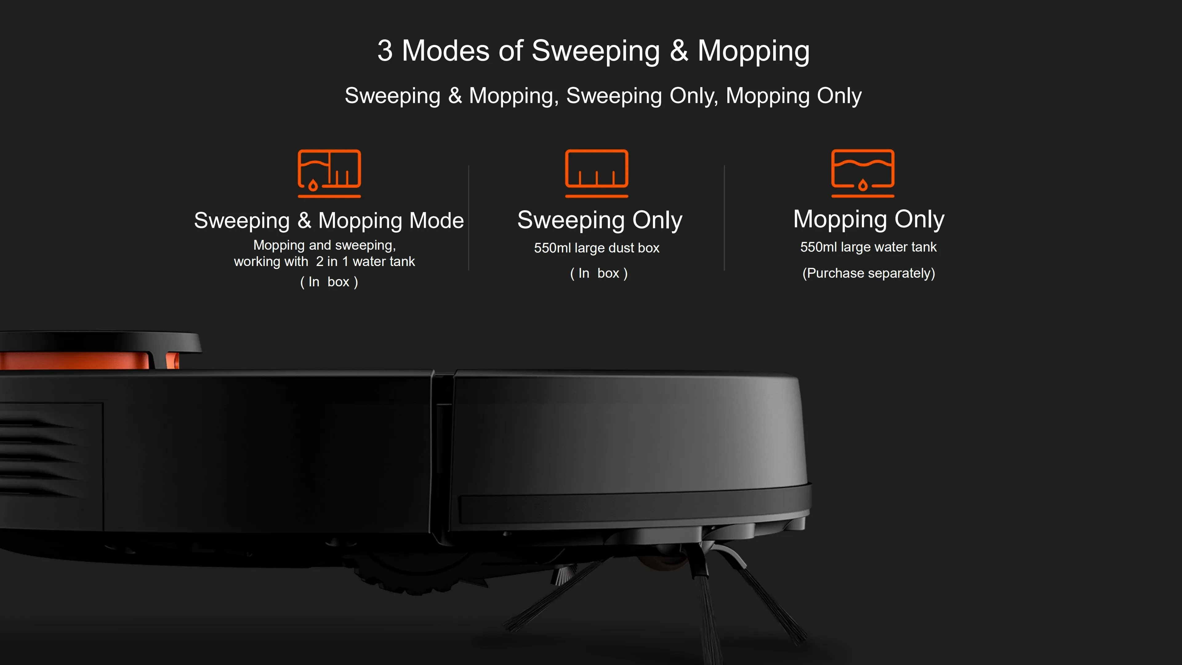 Поддержка 3 режимов подметания и уборки 1, режим подметания и уборки 2, подметание Всего 550 мл большая коробка для пыли 3, Всего 550 мл большой резервуар для воды
