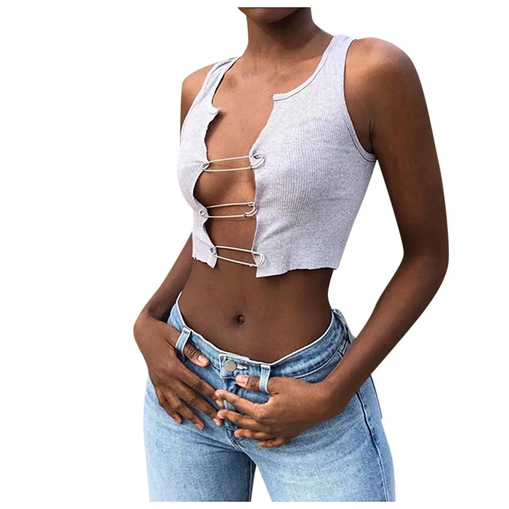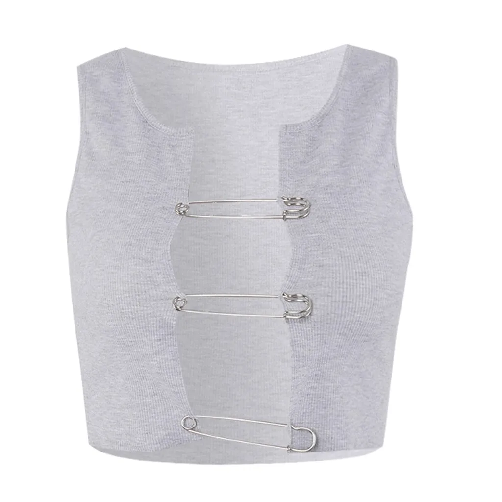 Женская серая футболка без рукавов с круглым вырезом Кардиган с штифтом на бретелях.