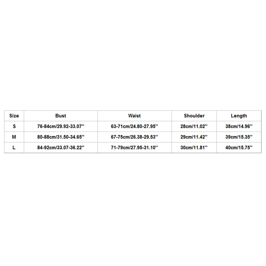 Размер Бюст Талия Плечо Длина S 76-84 см/29,92-33,07'' 63-71 см/24,80-27,95 дюйма 28 см/11,02'' 38 см/14,96'' М 80-88 см/31,50-34,65'' 67-75 см/26,38-29,53'' 29 см/11,42'' 39 см/15,35'' L 84-92 см/33,07-36,22 дюйма 71-79 см/27,95-31,10'' 30 см/11,81'' 40 см/15,75''