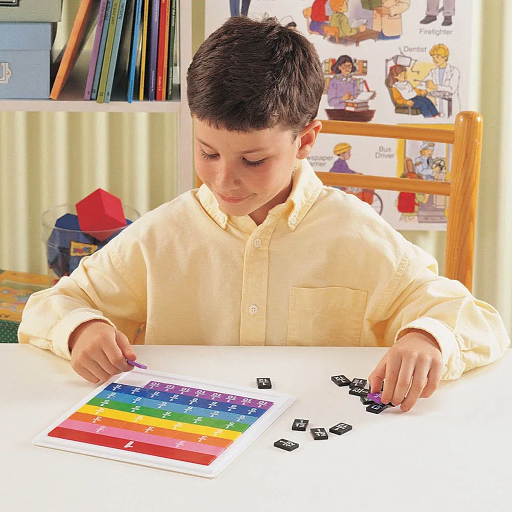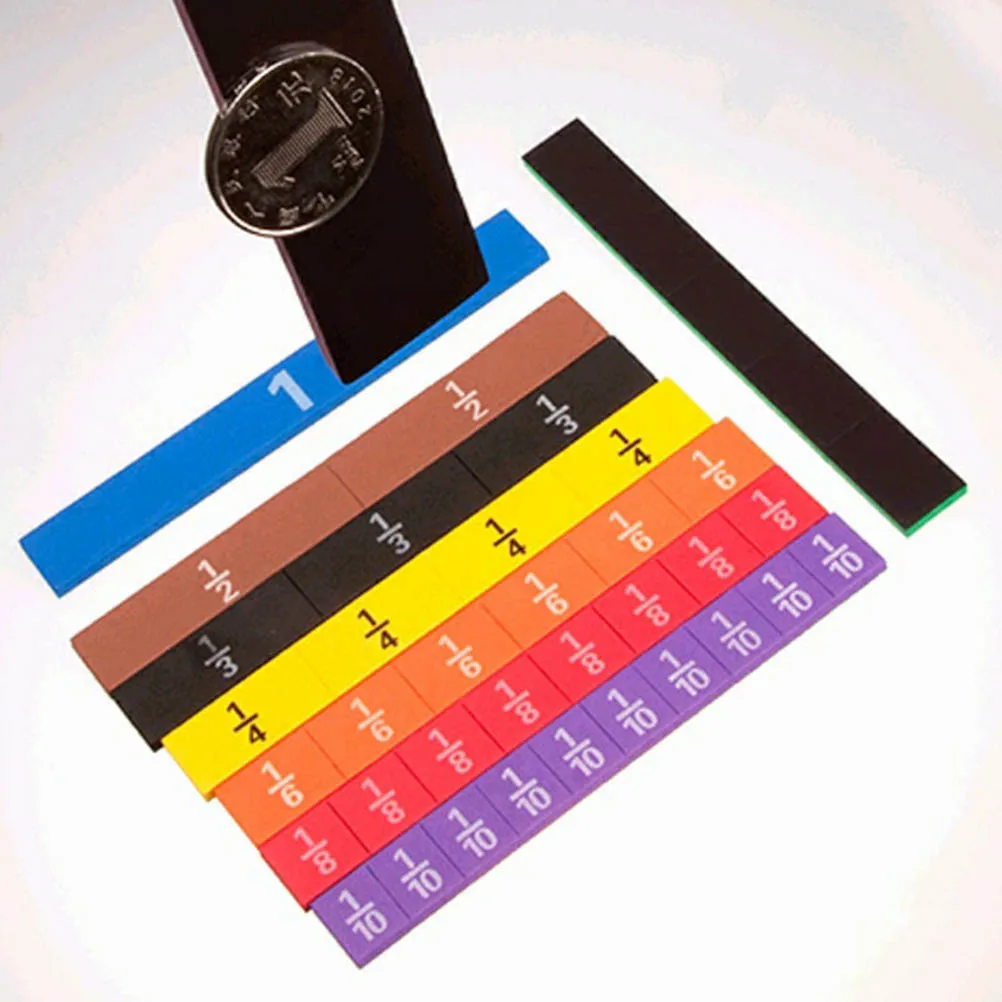 Плитки содержат 1, 1/2, 1/3, 1/4, 1/5, 1/6, 1/8, 1/10, 1/11 и 1/12, всего 51 шт. магнитных сегментов с числами.