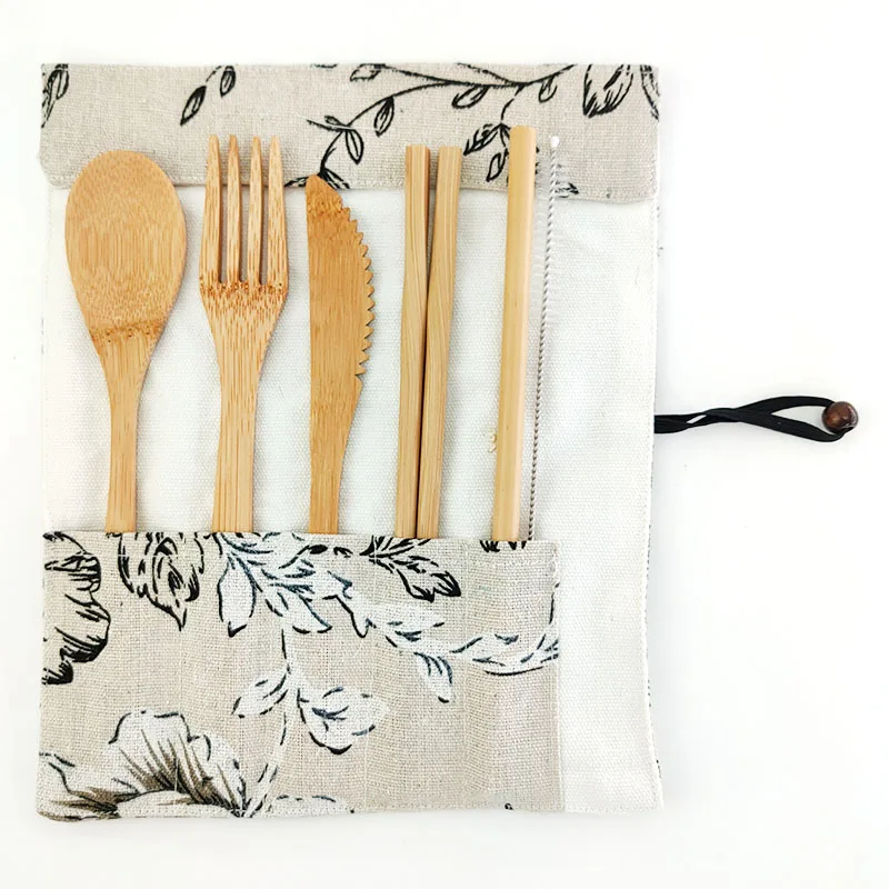 Горячие Экологичные столовые приборы набор бамбуковых столовых приборов набор ножей вилка ложка набор столовых приборов и тканевый мешок уличная портативная кухонная утварь