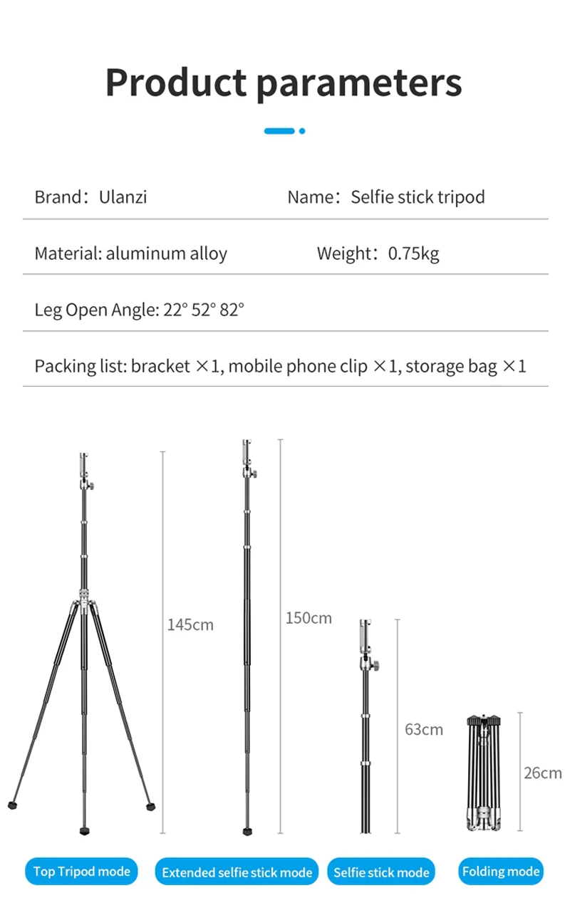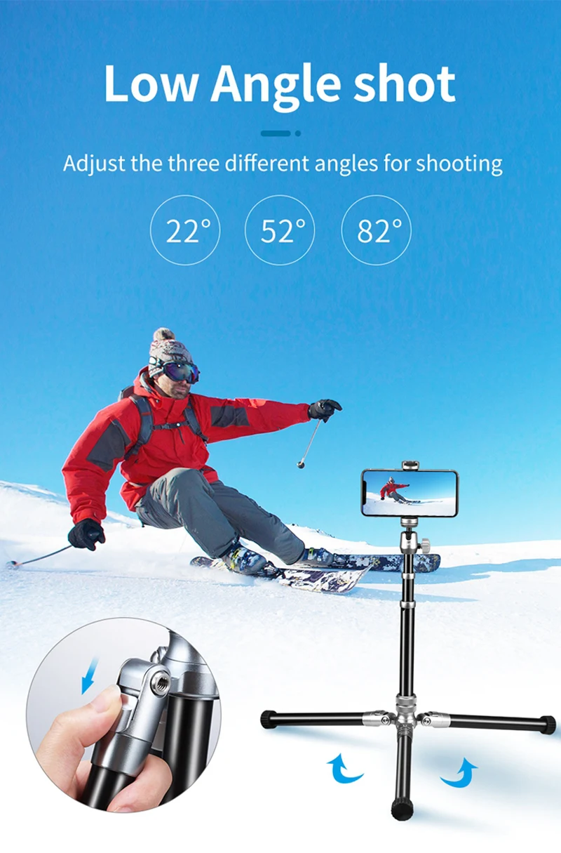 -Низкий угол съемки, потяните замок скольжения, чтобы зафиксировать штатив на три разных угла для съемки 22 ° 52 ° 82 °