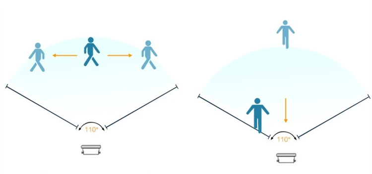 Расстояние срабатывания 1-6 метров, угол срабатывания 110 градусов