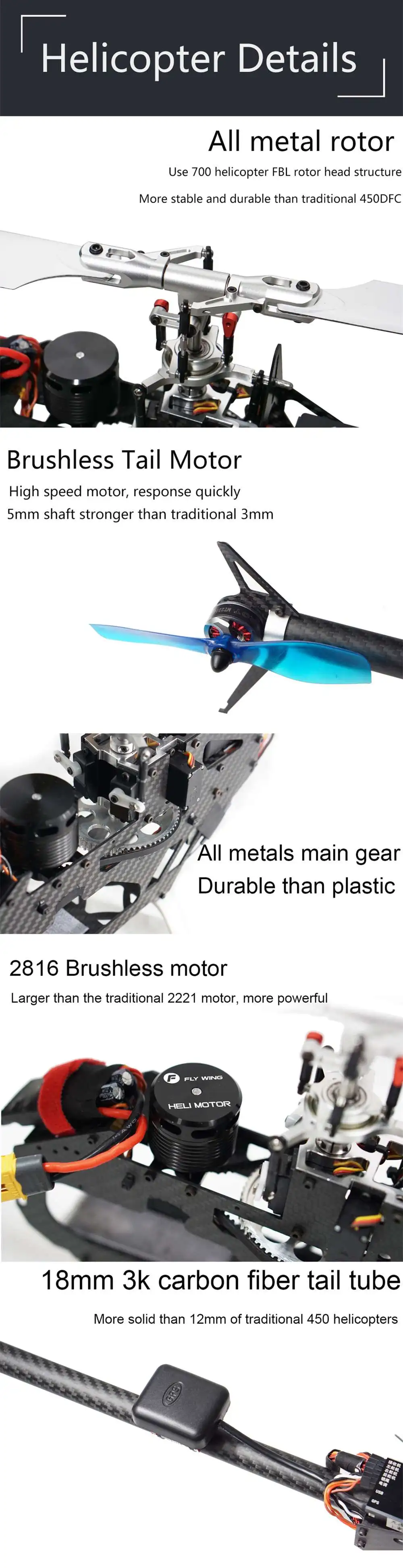 -Использование 700 класса вертолета цельнометаллического ротора, бесщеточный 5 мм вал хвостового двигателя, высокая скорость и чувствительный отклик.