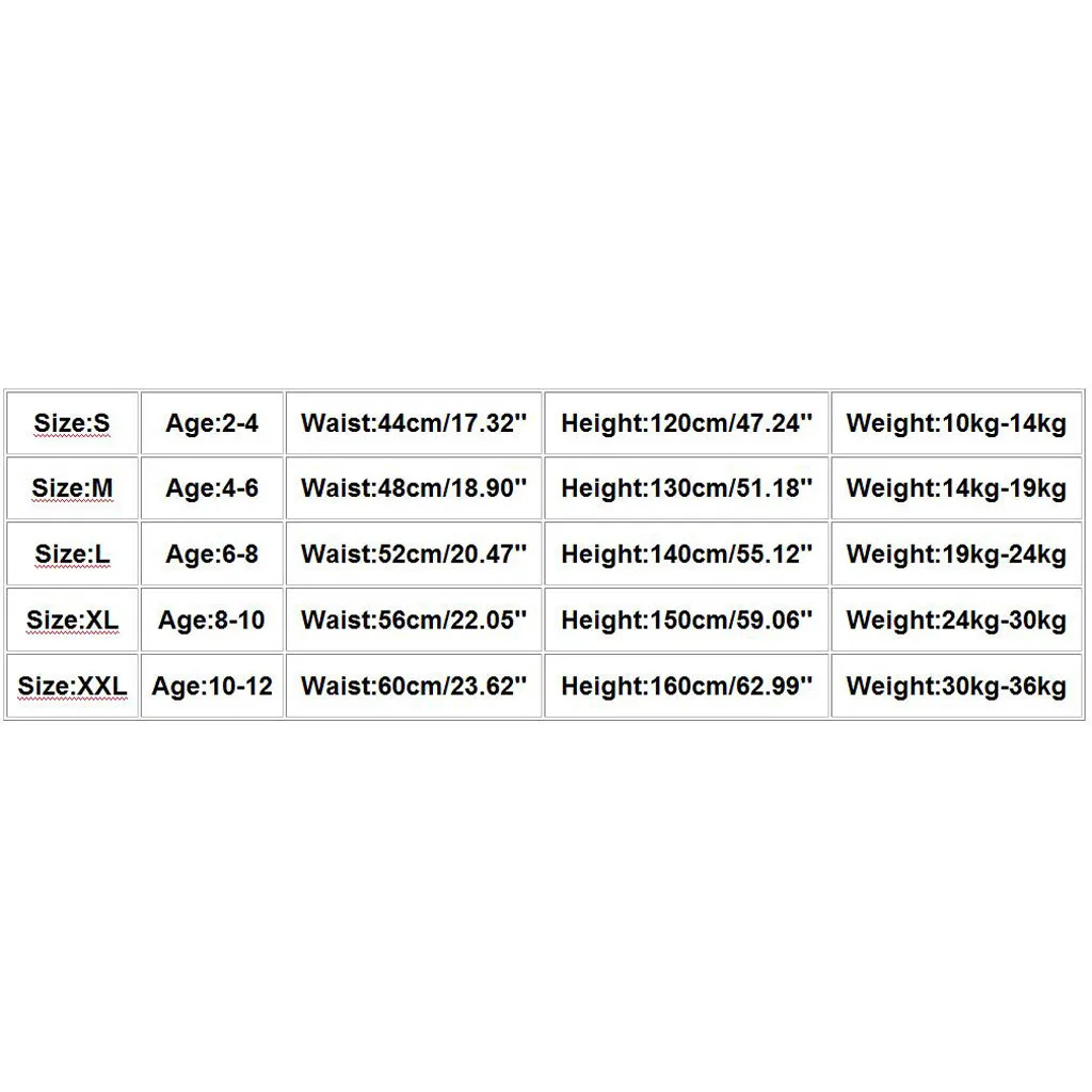 Размеры Возраст Обхват талии Высота Вес S От 2 до 4 лет 44 см/17,32'' 120 см/47,24'' 10 кг-14 кг М 4-6 48 см/18,90'' 130 см/51,18'' 14 кг-19 кг L 6-8 52 см/20,47'' 140 см/55,12'' 19 кг-24 кг XL 8-10 56 см/22,05'' 150 см/59,06'' 24 кг-30 кг XXL 10-12 60 см/23,62'' 160 см/62,99'' 30-36 кг