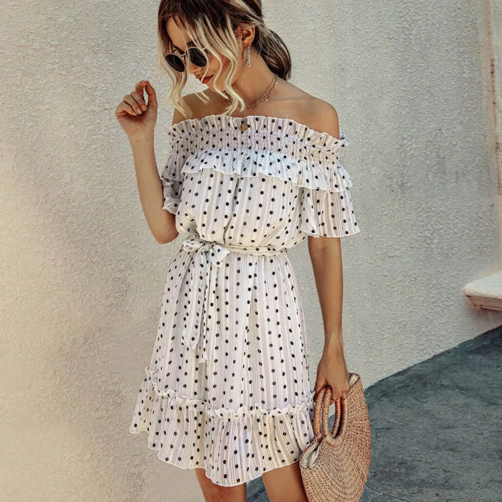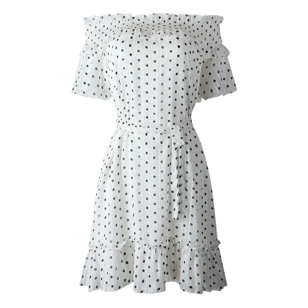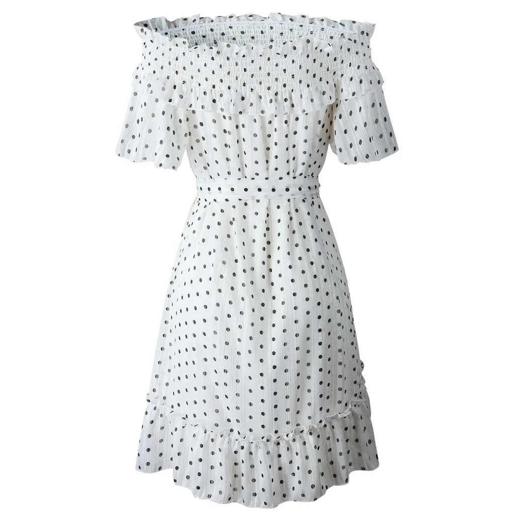 Характеристики: Повседневное мини-платье с короткими рукавами, открытыми плечами, оборками, вечерние платья в горошек, пикантная одежда, мини-платье, платье на лето и весну.