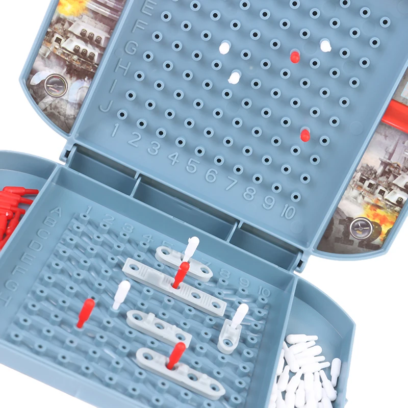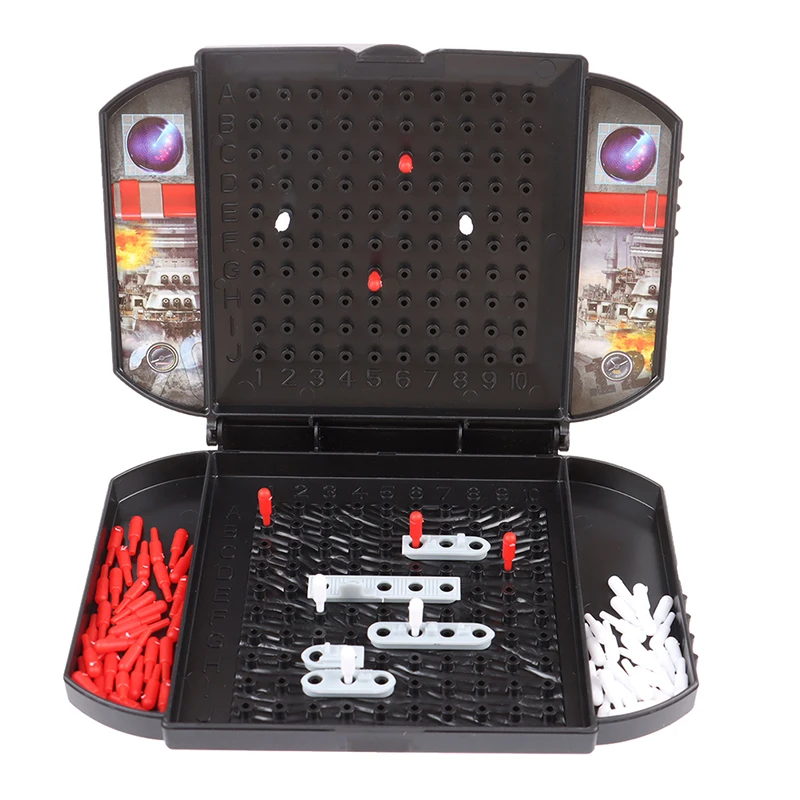 Включает в себя 2 портативных боевых ящика, 10 пластиковых кораблей, 84 красных колышка, 168 белых колышков, лист этикеток, инструкции.
