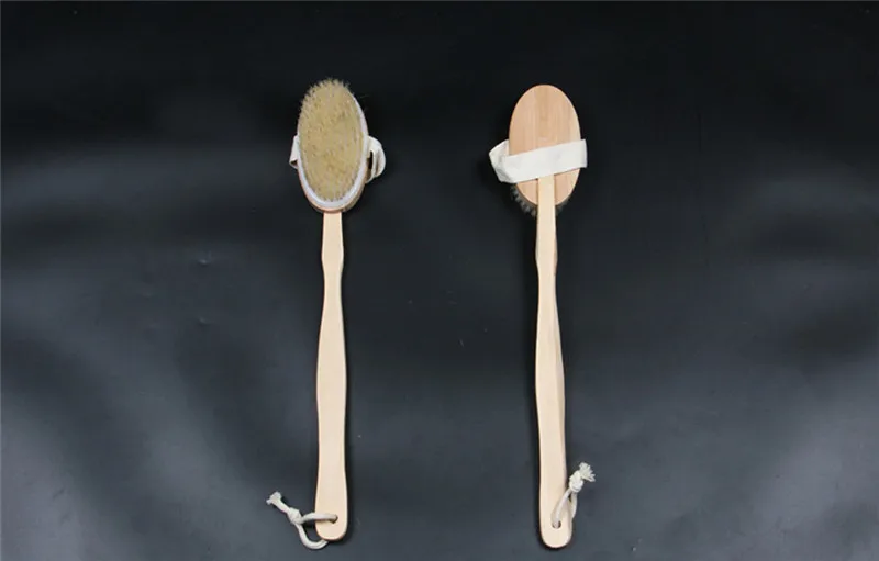 Bath brush with wooden handle and oval bristle brush Remove the handle and use it as a hand-held scrub brush Easy-to-grip handle extends your reach to those hard to get places, back for instance Canvas strap for easy holding