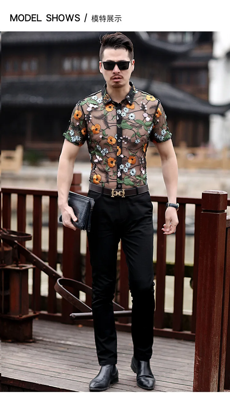 Flower Lace Shirt Embroidery See Through Shirt Men Chemise Homme Marque Luxe Mesh Transparent Shirt Summer Short Sleeve Shirt