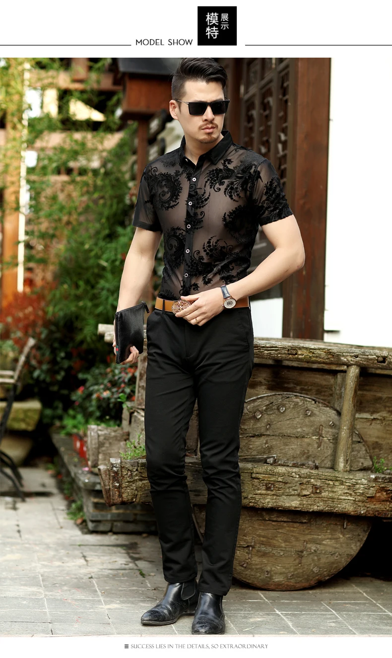 Прозрачная Цветочная рубашка с узором пейсли, 2018, летняя сексуальная прозрачная рубашка с коротким рукавом для выпускного вечера, Camisa Masculina Chemise Homme