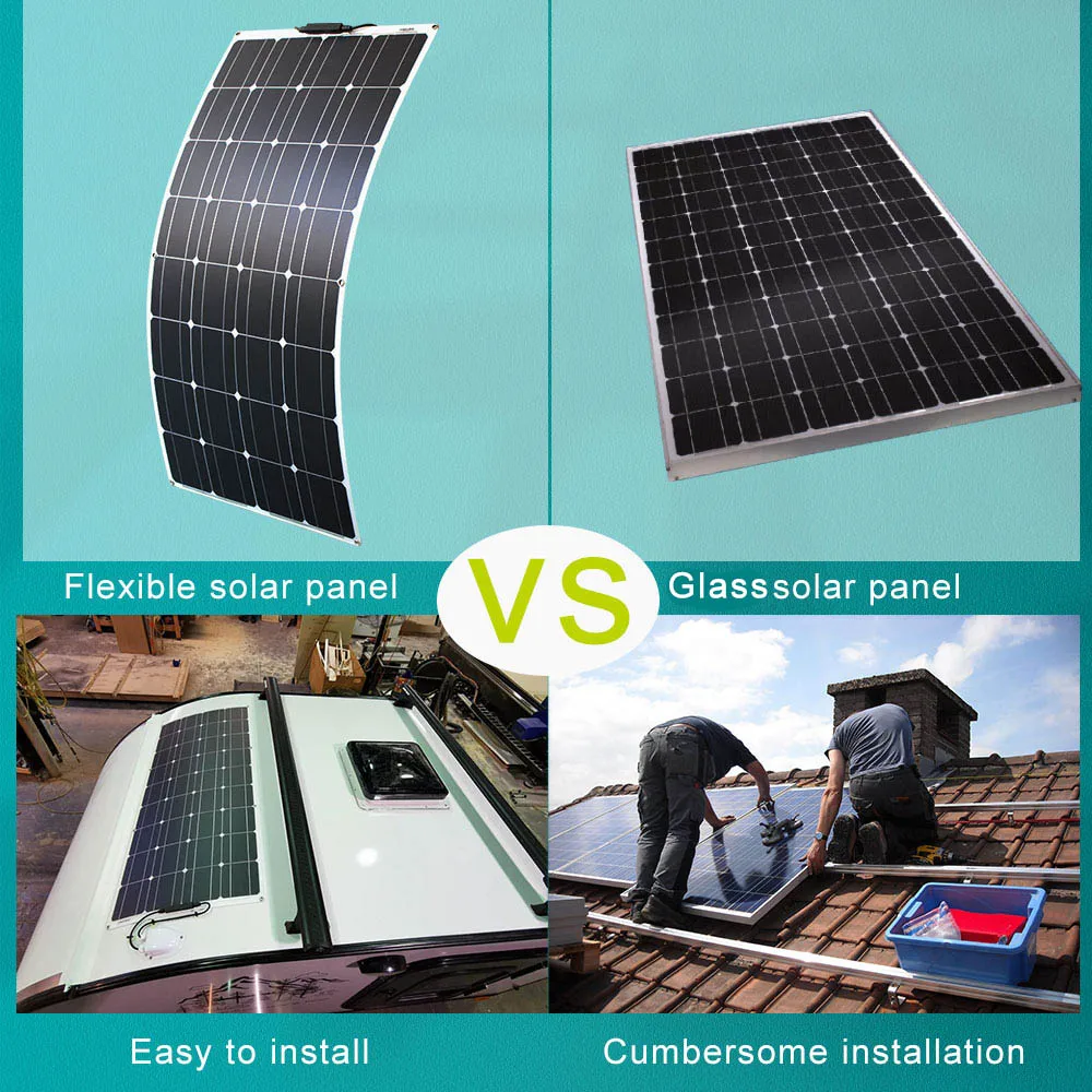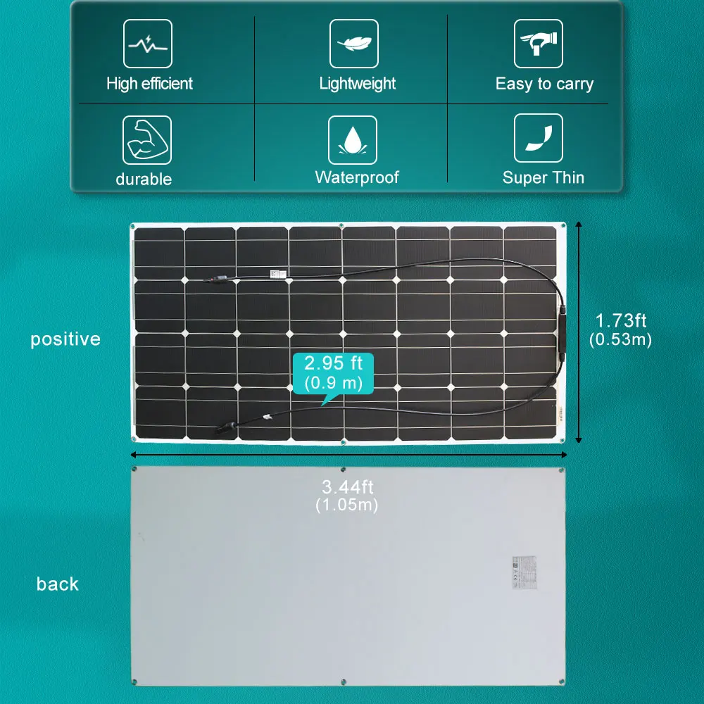 Различные с традиционными солнечными панелями, которые являются жесткими и часто заключены в закаленное стекло, 100 Вт Гибкая солнечная панель является чем-то, кроме традиционного. Гибкая солнечная панель мощностью 100 Вт тонкая и может сгибаться до 30 градусов, которая может быть легко установлена на изогнутых поверхностях, высокая эффективность до 21% с небольшим размером для большой выходной мощности, легкий вес всего 1,98 кг только четверть его традиционной 100 Вт стеклянной солнечной панели. Эта панель также может быть использована для различных применений, включая обеспечение питания на лодке, фургоне, гольф-машине, трехколесном велосипеде, крыше палатки, даже если подвесили на окно, чтобы запитать свет и другие приложения постоянного тока. Солнечная панель 100 Вт может заряжать аккумулятор 12 В или 24 В или заряжать устройства 3,7 в, 6 в, 9 В с регулятором.