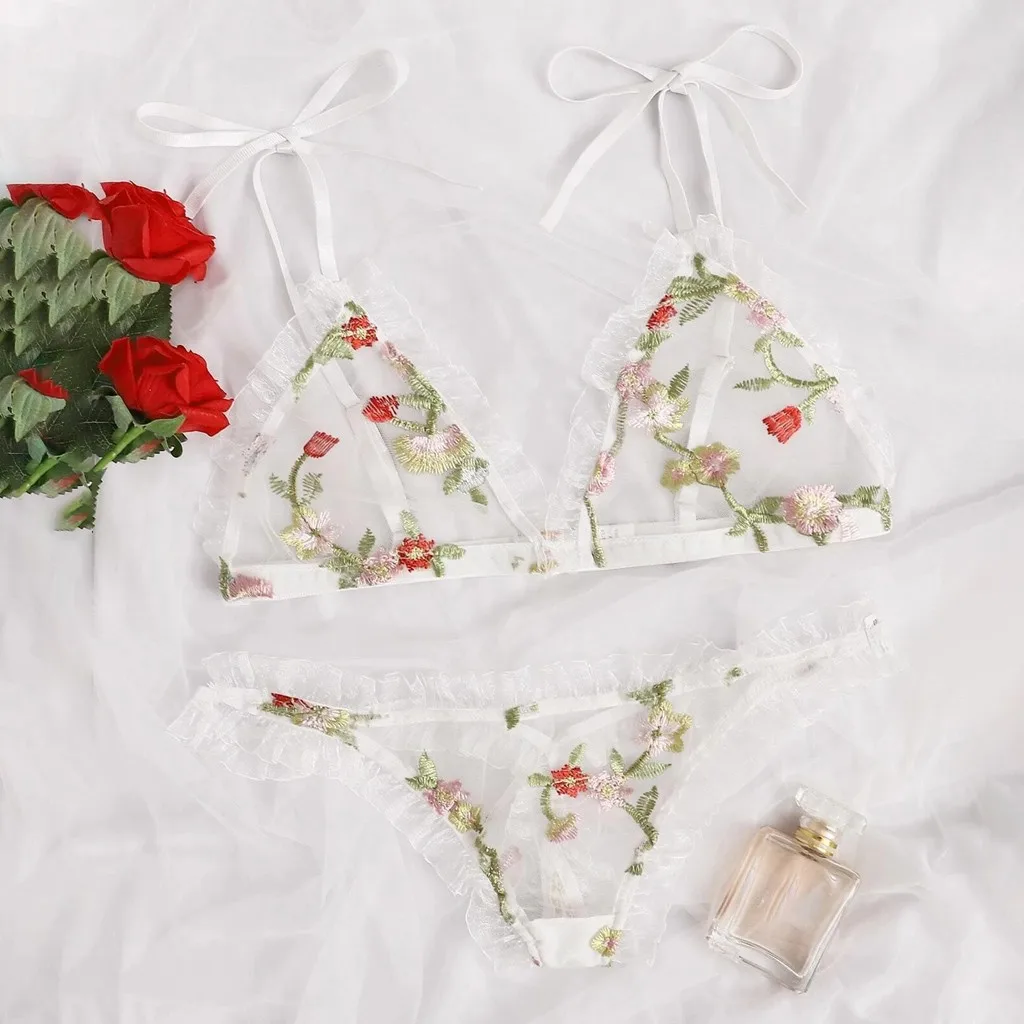 Новинка 2020, сексуальное женское белье с цветочной вышивкой, комплект из двух предметов, ночное белье, женская мода, стринги, нижнее белье, белая одежда для сна, M-2XL