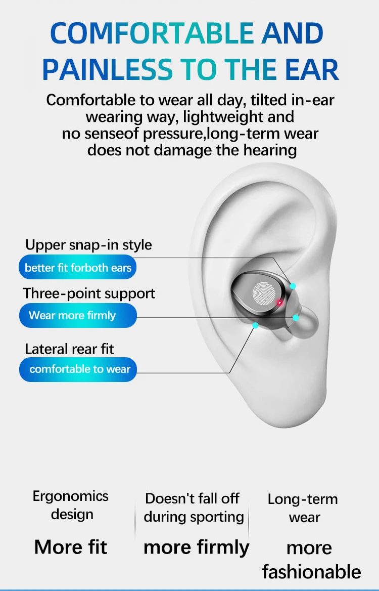 Описание: расстояние более 10 метров и время использования 4-5 часов 1. Беспроводные bluetooth-наушники 2. Светодиодный цифровой дисплей с двойной громкостью 3. Сенсорное управление Intelligente без сжатия (воспроизведение/пауза, ответ/отключение, переключение музыки) 4.Bluetooth 5,0 5. Быстрая зарядка с 4 контактами 6. Качество звука Hifi 7. Можно использовать в качестве держателя телефона 8. Hd голосовой помощник 9. Светильник вес 10. Интеллектуальное шумоподавление 11. Удобный и безболезненный для ушей, светильник вес, без давления, не вредит слуху 12. Водонепроницаемость и защита от пота, высокая производительность