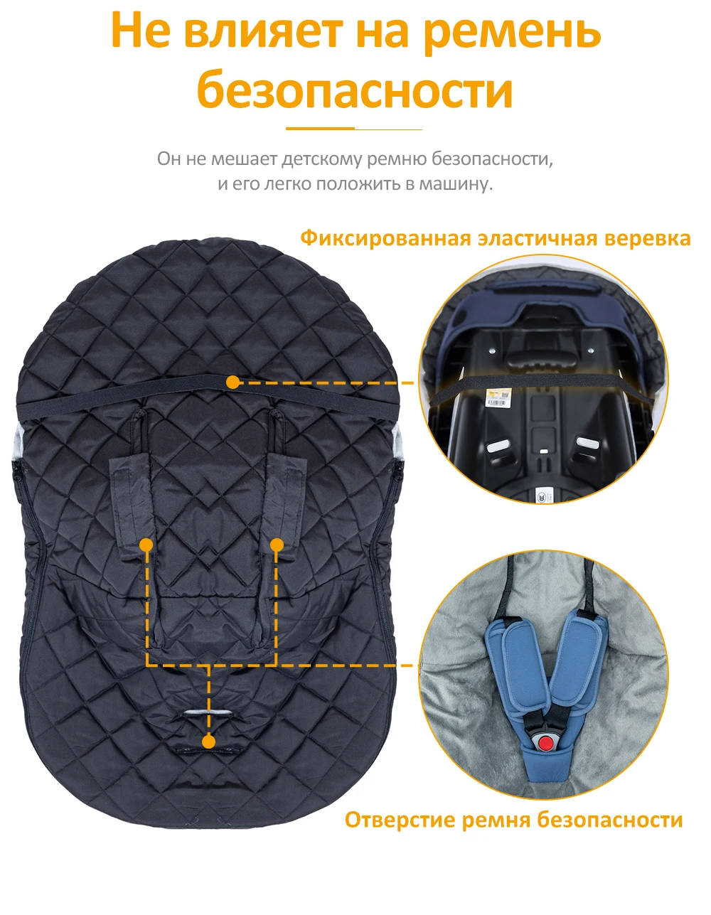 Он не мешает ремню безопасности ребенка и его легко положить в автомобиль. Есть ремешок на спине, чтобы убедиться, что спальный мешок не оторвется