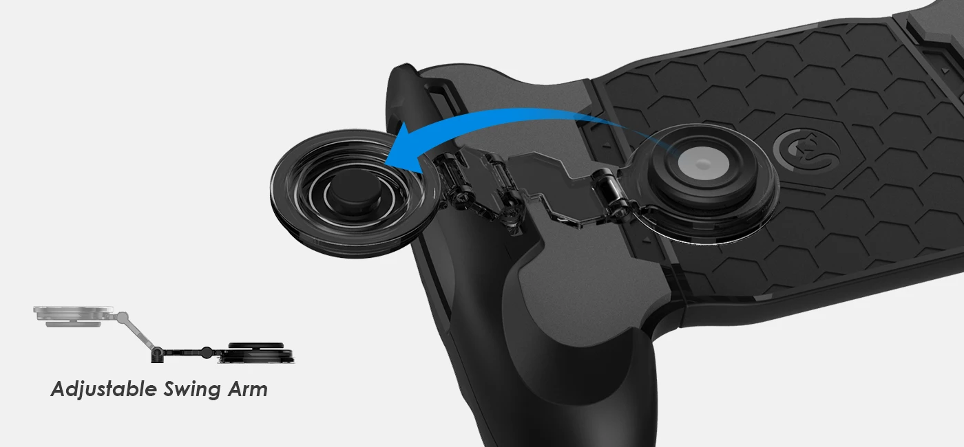 Джойстик интегрирует поворотный рычаг, который может поворачиваться на 180 ° и может быть нажат или сложен. Вы можете сложить или вставить его обратно на экран смартфона в любое время. Очень гибкий поворотный рычаг может гарантировать, что джойстик надежно закреплен на мобильных телефонах различной толщины, чтобы предотвратить потерю. Поворотный рычаг может быть легко разобран на три части, и двойной или одиночный режим джойстика может быть изменен по мере необходимости, обеспечивая полную гибкость для вашего стиля игры.