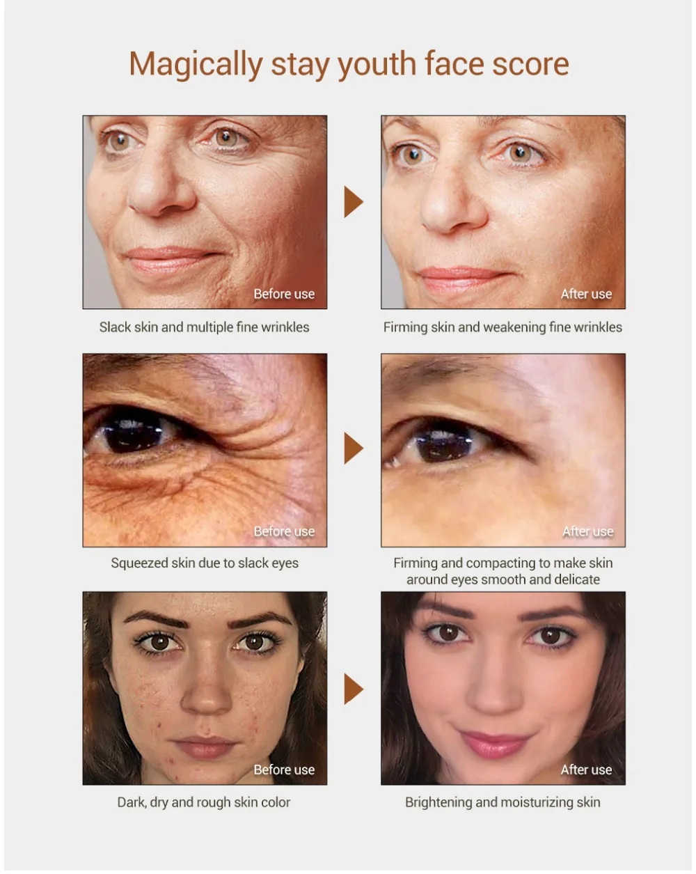Эффекты: пептид эффективно реорганизует эластичность коллагена, повышает активность эластина. Пять пептидных ингредиентов добавляются для развития коллагена, эластичных волокон и гиалуроновой кислоты, а также для дальнейшего увлажнения кожи, так что для затягивания кожи. Это поможет вам свести к минимуму мелкие морщинки и морщины, улучшит контуры глаз, обеспечивая при этом антивозрастной и увлажняющий эффект