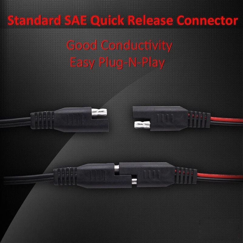 Быстроразъемный соединитель SAE: Стандартный быстроразъемный соединитель SAE с хорошей проводимостью, это позволяет напрямую подключаться к существующей розетке SAE вашего мотоцикла или подключаться к удлинительному кабелю с кольцевым клеммой, чтобы вы могли получить питание от аккумулятора двигателя, так удобно, что зависит от вас!