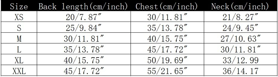 Примечание: 1 дюйм = 2,54 см, пожалуйста, выберите больший размер, если ваш питомец быстро растет или между 2 размерами s