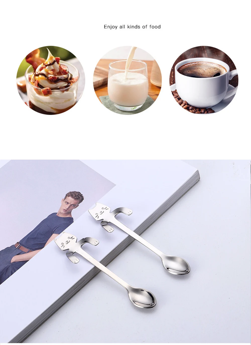 Характеристика: Нержавеющая сталь Кофе Чай ложка с кошкой ложки с длинной ручкой для супа/Мёд ложки, столовая посуда Чай & Кофе инструменты 100% новый и высокое качество Цвет: серебристый Размеры: 11,8*1,8 см Материал: сплав Вес: около 30 г Легко чистить Посылка: 8 креативных кофейных ложек