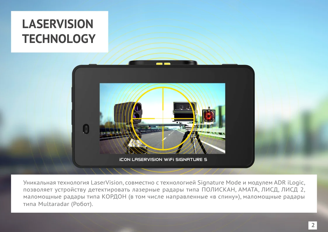 Технология LaserVision, совместно с технологией Signature Mode и модулем ADR iLogic, позволяет детектировать лазерные радары типа ПОЛИСКАН, АМАТА, ЛИСД, ЛИСД 2, маломощные радары типа КОРДОН и Multaradar (Робот), в том числе направленные «в спину».