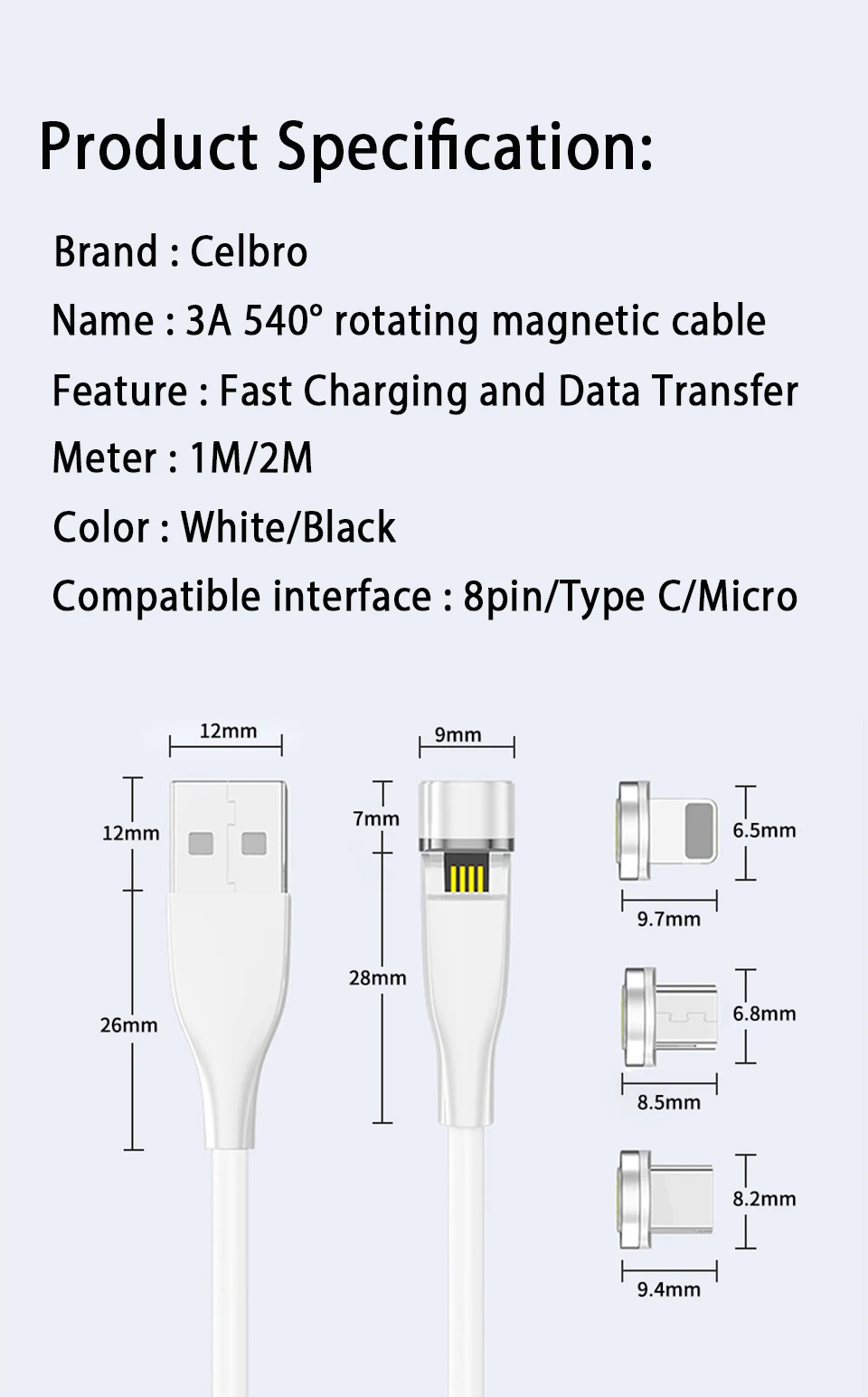 Бренд: CelBro® Товар: магнитный usb-кабель для зарядки * Функция: поддержка быстрой зарядки и передачи данных Характеристики: вращение на 180 и 360 градусов Бренд: CelBro® Товар: магнитный usb-кабель для быстрой зарядки 3A * Функция: поддержка быстрой зарядки и передачи данных Характеристики: вращение на 180 и 360 градусов Megnet, световой светильник Ток: Type c /micro plug max 3A 8-контактный разъем Макс 2.4A Тип: Micro USB / Type-C / 8pin Цвет: черный/белый Длина: 1 м/2 м