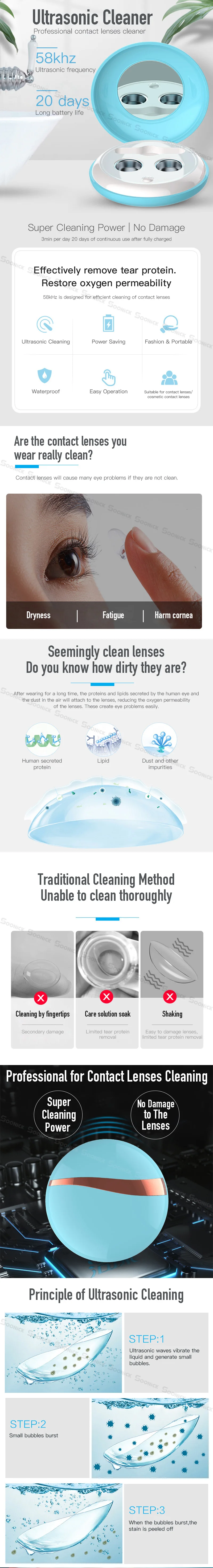 1. Профессиональный контактный Очиститель объектива-эффективно удаляет слезоточивый белок и бактерии, восстанавливает кислородную проницаемость, не повреждает. 58 кГц предназначен для эффективной глубокой очистки контактных линз. Каждый день 3 минуты очистки делают ваши глаза комфортное, яркое. Нет сухости, нет покраснения, нет инширования, нет других ощущений тела 2. Супер Чистящая мощность-Шаг 1: ультразвуковые волны вибрируют жидкость и генерируют небольшие пузырьки. Шаг 2: маленькие пузырьки лопаются Шаг 3: когда пузырьки лопаются, пятно отклеивается 3. Встроенный литиевый аккумулятор. 3 часа зарядки, 3 минуты глубокой очистки, 20 дней непрерывной работы 4. У нас есть около дизайн-мини и Портативный, Диаметр является 9,1 см, светильник вес. Конструкция вкладыша из нержавеющей стали, чтобы избежать вторичного загрязнения. Модный Цветной дизайн для вишневого розового и мятного синего цвета. 5. Подходит для контактных линз и косметических контактных линз