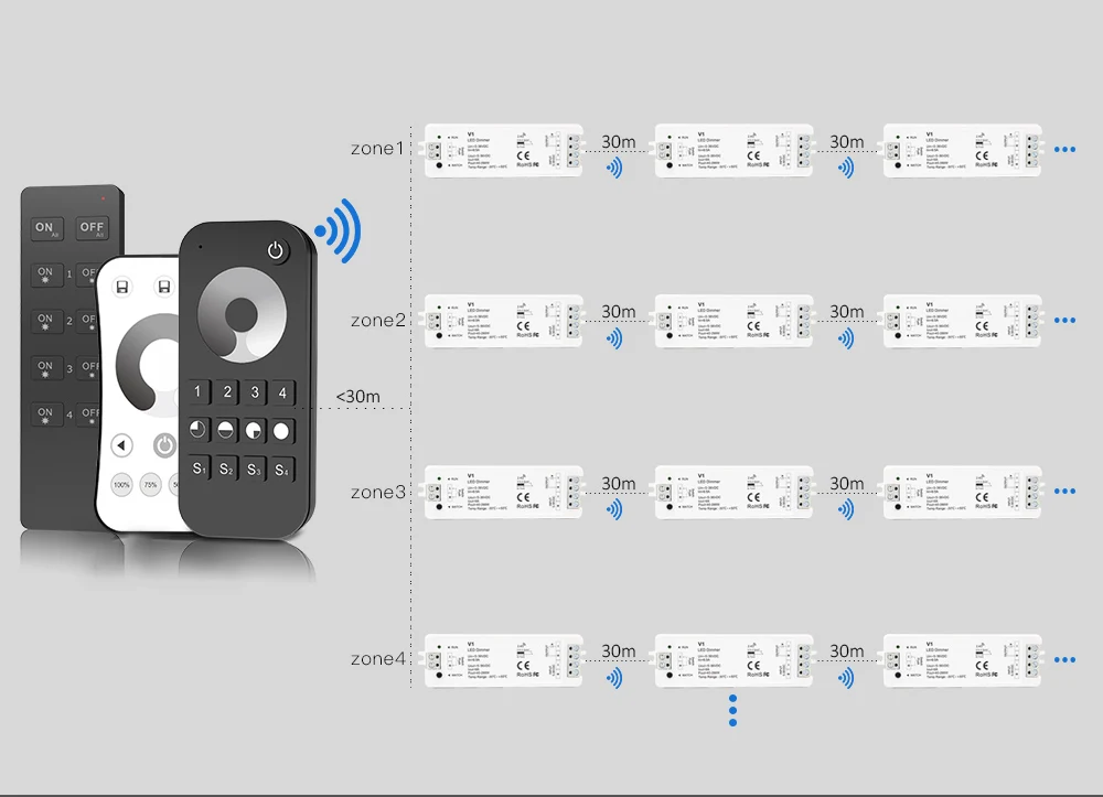 Один приемник V1 может управляться с помощью макс. 10 единиц дистанционного управления в пределах 30 м, пульт дистанционного управления 2,4G RF беспроводного управления.