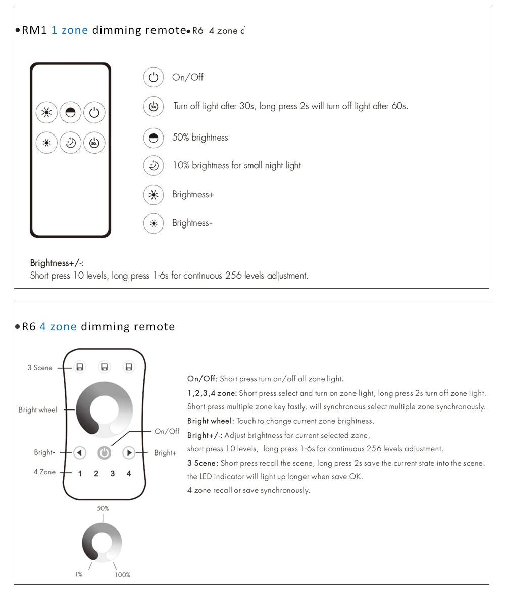 Вы также можете добавить кнопочный переключатель для реализации затемнения. Предоставляемый интерфейс Push-Dim позволяет использовать простой метод затемнения с использованием коммерчески доступных настенных Переключателей без фиксации (мгновенных). ● Короткое нажатие: Включение или выключение светильник. ● Длинный пресс (1-6 с): Нажмите и удерживайте, чтобы уменьшить яркость, С каждым другим длинным нажатием, светильник находится в противоположном направлении. ● Затемнения памяти: Светильник возвращается к предыдущему уровню затемнения при выключении и включении снова, даже при отключении питания. ● Синхронизация: Если к одному и тому же нажатию подключено несколько контроллеров, удерживайте их более 10 с, система синхронизируется, и все огни в группе тускнеют до 100%. Это означает, что нет необходимости в каких-либо дополнительных синхронных проводах в больших установках. Мы рекомендуем количество контроллеров, подключенных к кнопочному переключателю, не превышает 25 штук, Максимальная длина проводов от нажатия до контроллера должна быть не более 20 метров.