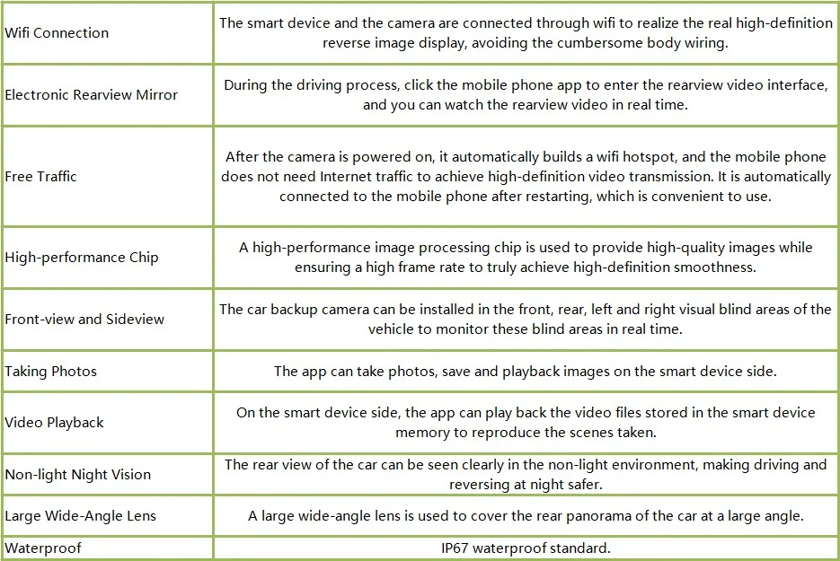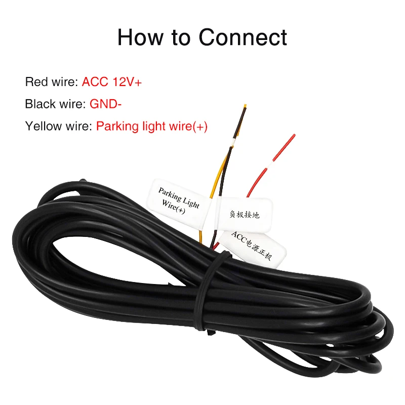Как подключить:1. Во-первых, выключите бортовой источник питания, и строго запрещено заряжать камеру без хорошего подключения.2. Определите положение установки камеры транспортного средства. (Есть два способа установки)● Первый способ установки, выберите положение камеры и поместите шнур питания в машину. Отрегулируйте угол обзора, Подключите два разъема питания, подключите прикуриватель и нажмите переключатель.● Второй способ установки, вырезанный открытый переключатель прикуривателя положения провода, красный и черный два провода. Красный (желтый) шнур питания подключен к источнику питания ACC 12V + положительное положение коробки предохранителя транспортного средства. Черный шнур питания подключен к отрицательному проводу GND транспортного средства, который может быть использован при запуске транспортного средства.3. Подключите шнур питания к правильному положению, отрегулируйте лучший угол обзора и закрепите поддержку клеем 3m.