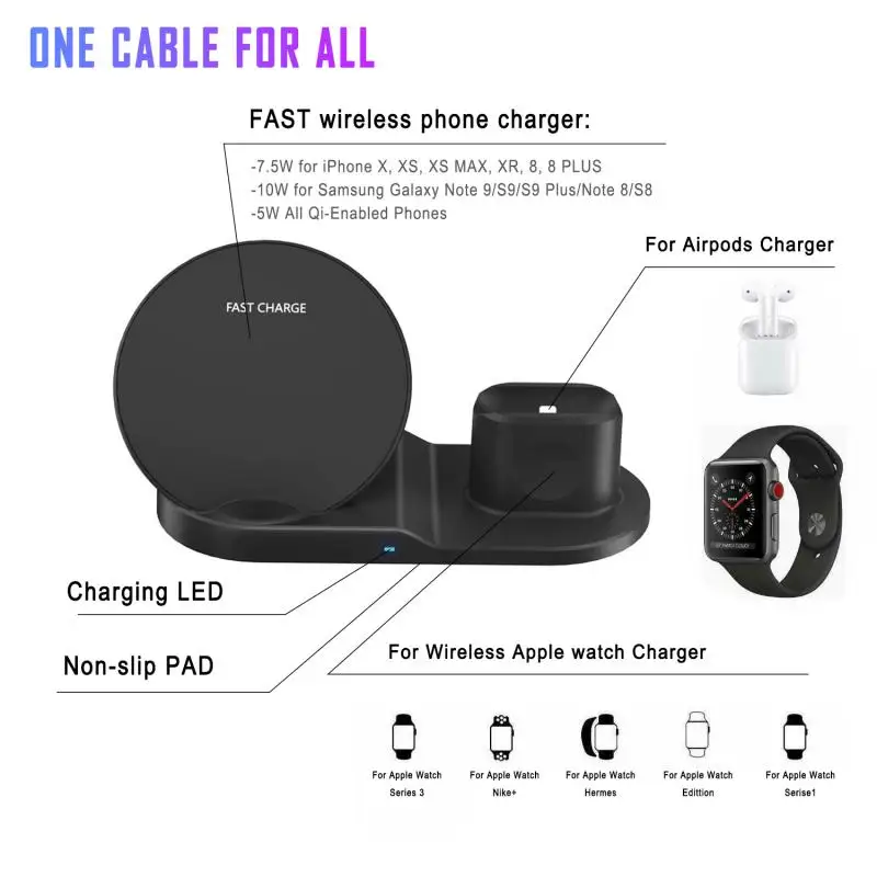 ▲ 100% новый и высококачественный материал Fast 3 в 1 Быстрое беспроводное зарядное устройство держатель может зарядное устройство для Apple watch, смартфона, Airpods в то же время ▲Для Apple может поддерживать быструю зарядку 7,5 Вт ▲Для Samsung может поддерживать быструю зарядку 10 Вт ▲Защита от перегрева, Автоматическое отключение питания делает зарядное устройство более безопасным Fast быстрое зарядное устройство доступно только при условии соответствия с оригинальным адаптером ▲ Если у вашего мобильного телефона нет функции беспроводной зарядки, вам нужно купить беспроводной приемник (не входит в комплект). ▲ 5 в 2 а является нормальной скоростью зарядки, не может заряжать iWatch. Мы рекомендуем быстрый адаптер зарядного устройства QC 2,0/QC 3,0 (9 В/1,67 а) для лучшей зарядки. ▲Расстояние зарядки 0-8 мм. Пожалуйста, не устанавливайте защитный чехол, который толще 3 мм. ▲ Если ваш Apple Watch был обновлен, будут проблемы с совместимости системы, что приведет к тому, что он не будет заряжаться нормально.