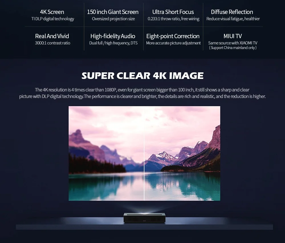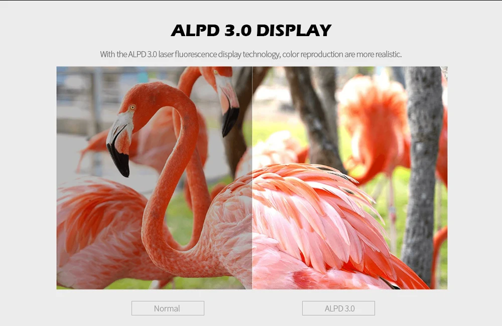 Это первый в мире ультра-короткий проектор с передовой технологией лазерного дисплея (ALPD), который обеспечивает до 150 дюймов 4K качественные изображения в 50 сантиметров, С чтобы обеспечить длительный срок службы до 25000 часов.