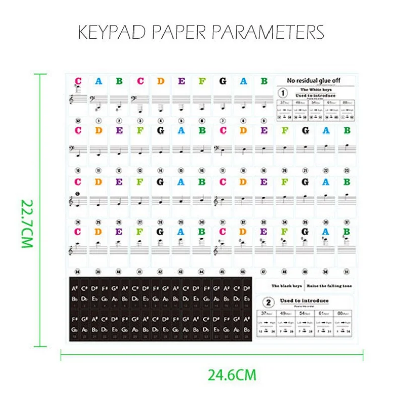 1 эта наклейка на клавиатуру изготовлена из высококачественного прозрачного ПВХ по тонкой технологии, она прозрачная и прозрачная на клавишах. 2 Эта наклейка изготовлена из экологически чистого материала и может использоваться повторно. Он не сохранит клей и не повредит ключи в использовании. 3 эта наклейка на клавиатуру является хорошим помощником в быстро знакомстве с ключами, и она может помочь новичкам быстро пересечь начальную стадию. 4 эта наклейка используется для фортепиано, электронного пианино, рояль в рулоне. Это универсальная наклейка. 5 Эта наклейка имеет две спецификации на выбор, и вы можете выбрать соответствующие наклейки в соответствии с вашими потребностями. 6 Эта наклейка изготовлена из экологически чистого клея и очень четко наклеивается на ключи, так же, как напечатано на ключах, ее очень легко снять.