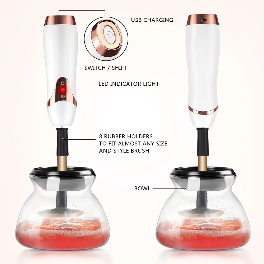 1. Мощность: 3 Вт, Материал: АБС и силикатный гель + ПЭТ. 2. Зарядка через USB. Время зарядки: 120 минут. Светодиодный светильник, 2 регулировки скорости, Преимущества продукта: 1: обтекаемый дизайн продукта, идеальная ладонь. 2: поверхность изделия обработана фортепианной краской и УФ. Устойчивость к царапинам, хорошее ощущение. 3: продукт имеет тонкую структуру, хорошую фиксацию двигателя, низкую вибрацию и низкий звук. 4: встроенная стабильная печатная плата, стабильный ток, экономит потребление батареи, работает в сбалансированном состоянии, не будет качания стержня. 5: контейнеры изготовлены из пищевых материалов, а не из стакана, не сломаются, не сбиваются. 6: высокая скорость, стабильный двигатель, 10S мыть и сушить. Полностью автоматические косметические кисти, всего 10 секунд для восстановления новой кисти, больше не нужно беспокоиться о громоздком процессе очистки после макияжа. Восемь силиконовых гелевых головок в основном подходят для 95% косметических кистей на рынке.