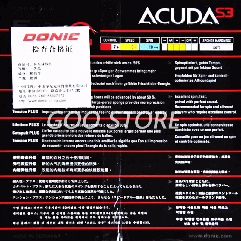 Резина для настольного тенниса danic ACUDA S3, сделанная в Германии, вращающая все вокруг прыщи с губкой для пинг понга tenis de mesa Самое сильное вращение, быстрый и громкий. Очень мягкая губка добавляет прикосновение и звук, обеспечивая большую скорость во время сильного вращения и нажатия. Звук громкий и уникальный. Подходит для дуг и всех игроков, которым требуется превосходное управление мячом. Управление: 7 + Скорость: 9 Спина: 10 A + + Толщина: макс (2,2 мм) Твердость: мягкая