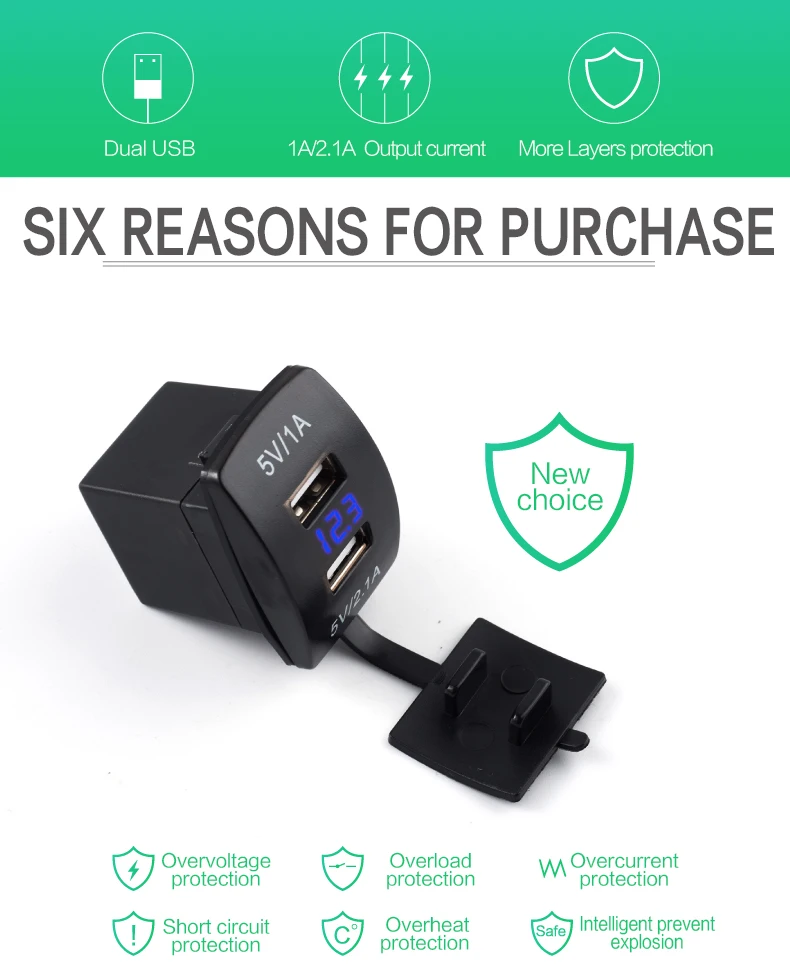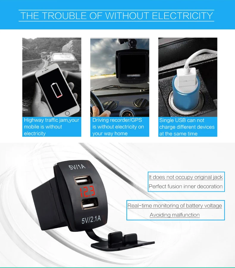 1. Основание панели с одним отверстием: дисплей напряжения + двойной USB. Небольшой размер и отличная производительность. Простота установки, удобство в использовании. Универсальный подходит для автомобиля 12 В, мотоцикла, ATV, лодки, автомобиля или корабля. 2. Двойной выход USB позволяет заряжать 2 usb-устройства одновременно, чтобы сэкономить ваше время. USB зарядное устройство широко используется для электрооборудования питания, таких как транспортное средство, GPS, мобильный телефон, камера, mp3. 3. Интеллектуальная конструкция цепи защищает от чрезмерного тока, перегрева и перезарядки. Обеспечить безопасность зарядки. 4. С многофункциональной функцией защиты: Встроенный идентификационный резистор, защита от обратной полярности, защита от перегрузки по току, защита от перегрева, защита от короткого замыкания. Умный дизайн для защиты вашего устройства от повреждений. Технические характеристики: Материал: АБС-пластик Вход напряжение: DC12V / 24V Класс защиты от поражения электрическим током: IP66 Двойной USB Порты и разъёмы: Рабочее напряжение: 12-24 В Выход ток: 4.2A Выходное напряжение: 5 В Светодиодный светильник: синий Гнездо для автомобильного прикуривателя: Рабочее напряжение: 12-24 В Выходное напряжение: 12-24 В Напряжение Дисплей: Диапазон отображения вольтметра: 6-24 В Цвет вольтметра: синий/красный/зеленый Посылка включает в себя: 1 x Автомобильное зарядное устройство USB