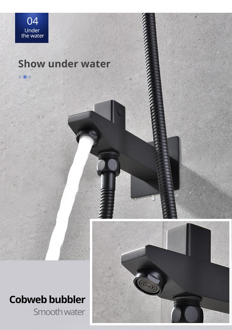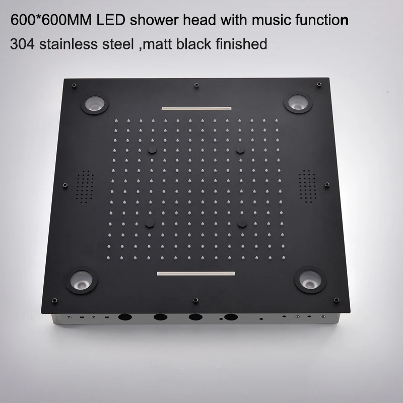 1. Размер душевой головки: 600*600 мм 2. Материал: нержавеющая сталь 304 для душевой головки и душевого шланга. Латунь для других. Черная отделка 3. Нить продукта: G1/2 ". 4. Функции: дожди, водопад, спа режим тумана, ручной душ и вниз носик воды. 5. Светодиодный: многоцветный, изменен на пульт дистанционного управления или мобильный телефон 6. Музыка управляется через мобильный телефон 7. Клапан: 4 + 1 небольшой поток термостатический смеситель клапан с пластиковой встроенной коробкой или 4 + 1 небольшой поток смеситель холодной и горячей воды клапан с пластиковой встроенной коробкой