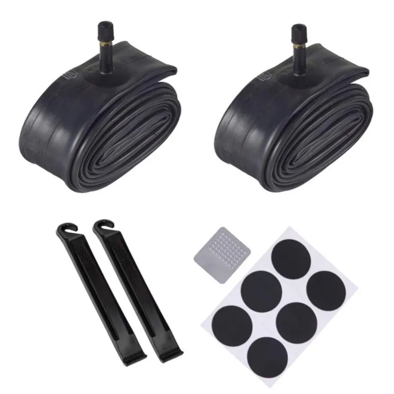 2 внутренних трубки велосипеда, 2 шиномонтажных стержня, 6 самоклеящихся круглых пластырей, 1 металлический чистящий файл