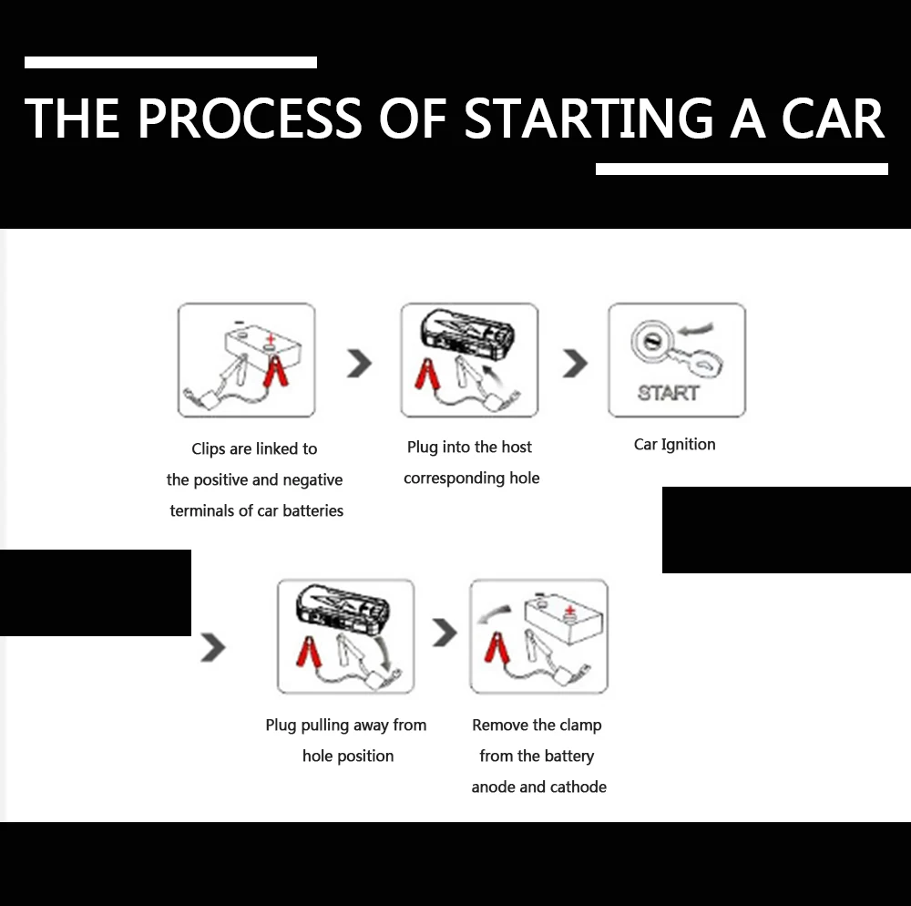 1. Этот аварийный стартер имеет достаточно мощности (30000 мАч), чтобы начать большинство автомобилей 12 вольт и 24 Вольт в дороге! Подходит для автомобилей, мотоциклов, морских самолетов, вездеходов, внедорожников, газонокосилок, яхт, лодок, пикапов, снегоходов и т. д. Он полностью заряжен в течение 5 часов и может быть заряжен в течение длительного времени. 2. Передовые Технологии защиты: Интеллектуальный прыгающий Кабель использует различные передовые технологии безопасности, включая защиту от перегрузки по току, защиту от перегрузки, защиту от перенапряжения, защиту от перезаряда и защиту от высоких температур, чтобы гарантировать безопасность использования любым человеком. 3. ЖК-экран и совместимость: Новый ЖК-экран может полностью отображать оставшуюся мощность. Этот компас поможет вам найти свой путь к вашему дому, когда вы потеряете свой дом.