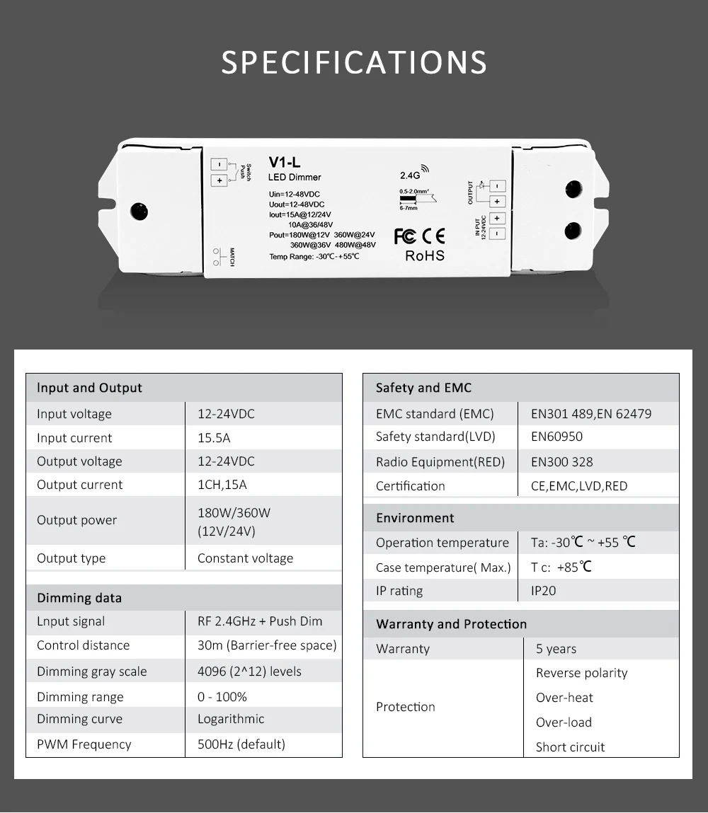 Одноцветная Светодиодная лента диммер (MJJCLED-V1-L) 1 канал/шаг-меньше затемнения/беспроводной пульт дистанционного управления/Push Dim/Множественная защита ● Входное напряжение: 12-24 В постоянного тока ● Входной ток: 15,5a ● Выходное напряжение: 12-24 В постоянного тока ● Выходной ток: 1CH,15A ● Выходная мощность: 180 Вт/360 Вт (12 В/24 В) ● Тип выхода: постоянное напряжение ● Вход сигнал: RF 2,4 ГГц + пуш-ап Dim ● Расстояние управления: 30 м ● Уровень затемнения: 4096 уровней ● Диапазон затемнения: 0 -100% ● Кривая затемнения: логарифмический ● Частота ШИМ: 500 Гц (по умолчанию)