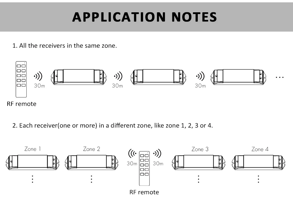Несколько приемников на расстоянии 30 м могут работать синхронно, когда они контролируются Через тот же пульт дистанционного управления. Размещение приемника может обеспечить расстояние связи до 30 м. Тем не менее, мы рекомендуем для внутреннего применения Что расположение приемника не должно быть больше, чем 15 м. ● MJJCLED-RT1/R11/R1/R6-1/R1-1/RM1 может управлять только всеми зонами, работающими синхронно ● MJJCLED-RT6/RT8/RS1/RU4 может управлять всеми зонами, работает синхронно и неравномерно