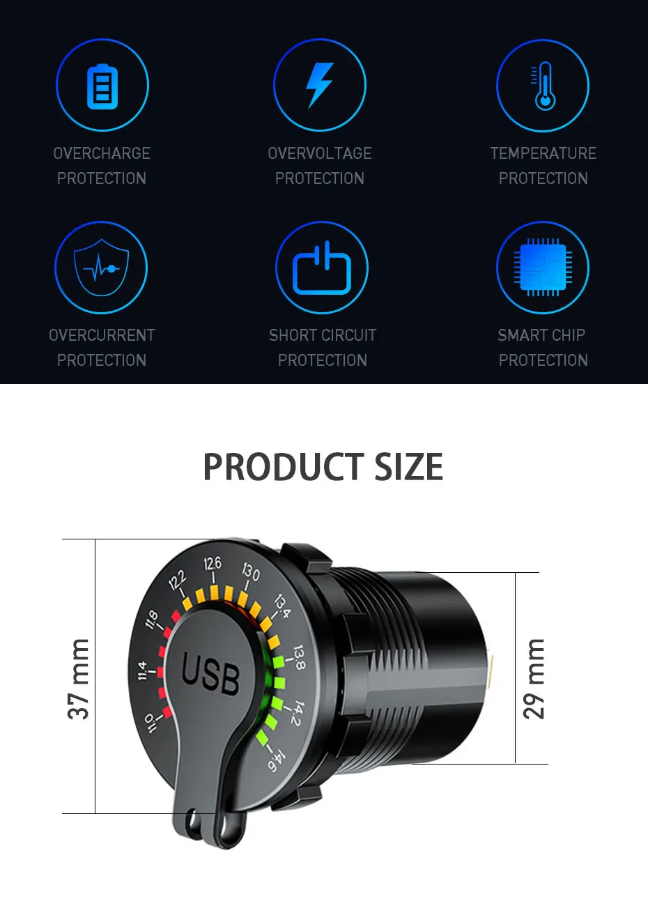 Как использовать:1. Нажмите кнопку, чтобы включить питание, подождите 2 с, будет отображаться напряжение в реальном времени.2. Нажмите кнопку еще раз, чтобы перейти в режим красного индикатора питания. Оба режима дисплея могут свободно переключаться кнопкой,3. Нажмите переключатель для 2s, чтобы выключить устройство. Особенности: 1: Это Интеллектуальное Быстрое зарядное устройство QC3.0 с дисплеем напряжения, предупреждением о высоком напряжении, оно может отображать скорость зарядки,2. Есть переключатель, который может свободно Переключить режим отображения и включить/выключить питание.3. Красный индикатор светильник будет светильник до тех случаях, когда напряжение на входе превышает 14,6 V, контролировать напряжение в любое время.4. Когда устройство заряжается для вашего телефона, светильник потока будет работать циклически.5. Подходит для мобильных телефонов, планшетных ПК, GPS и других usb-устройств Характеристики:Материал изделия: АБС-пластикЦвет изделия: черныйВходное напряжение: 12-24 В постоянного токаВыход USB 1: 5 В/3 А постоянного тока; 9 В/2 А; 12 В/1,5 АВыход USB 2: 5 В/3 А постоянного тока; 9 В/2 А; 12 В/1,5 АРазмер: 50x37x29мм Примечание:1. Фотографии только для справки. Фактический продукт должен превалировать.