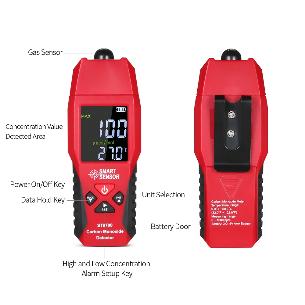 Диапазон измерения: CO: 0~1000PPM, температура: 0~50℃/32~122℉