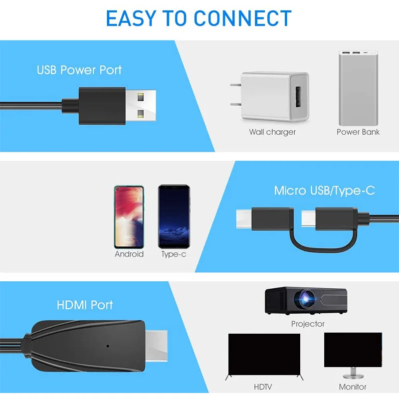 [Plug and Play] No need to install any driver. Plug the HDMI cable into the TV and switch the TV to the HDMI channel. Plug the USB cable into the power adapter (at least 5V 1A). Plug the Micro-USB (MHL) data cable directly into the Android device and restart the device after completing the entire connection.