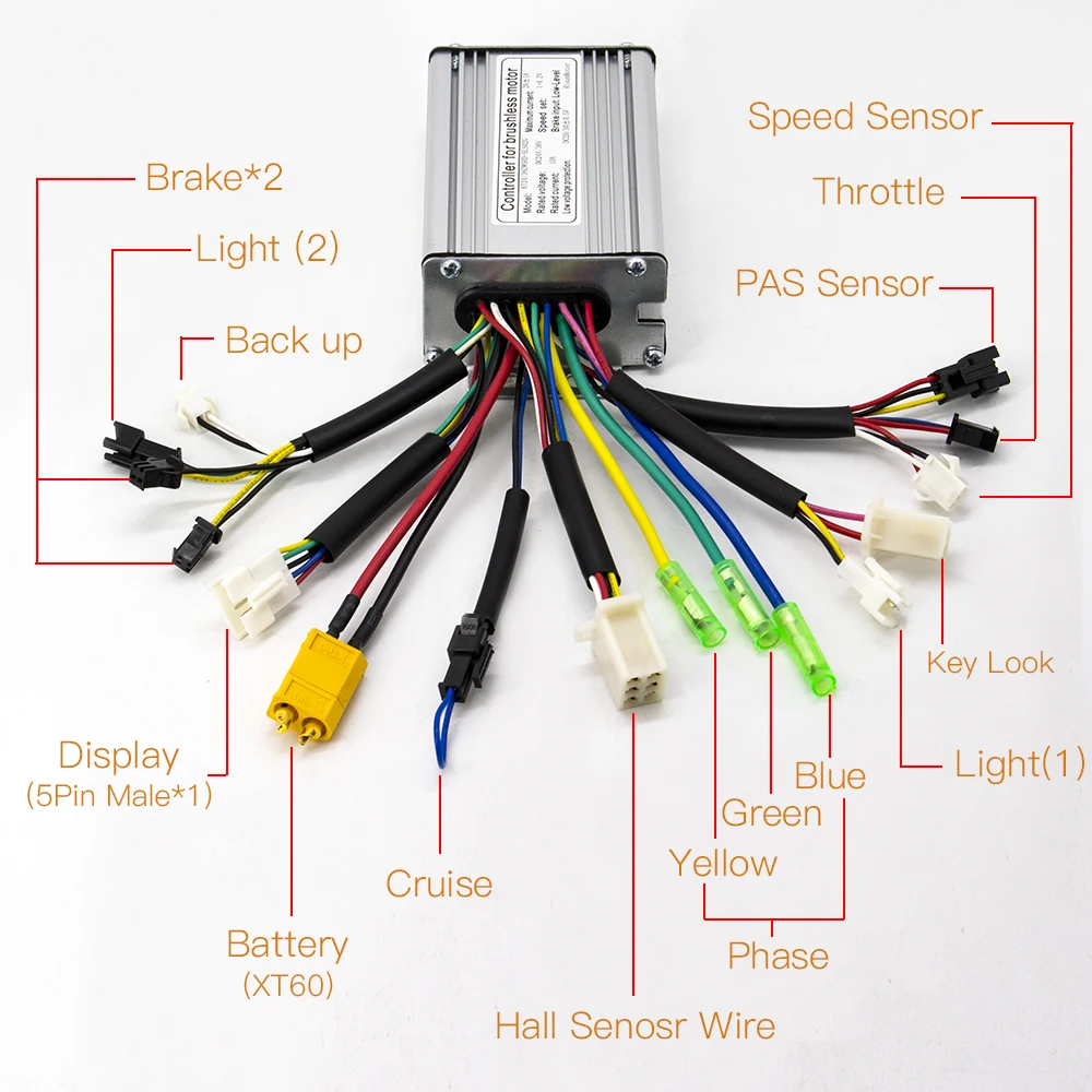 Подходит для сенсорный двигатель 250 Вт/350 Вт 24 В 36 В Универсальный (поддерживает оба напряжения) 1.Mosfet:6 mosfet 2. Рабочее напряжение: 36 В или 24 В постоянного тока 3. Номинальный ток: 8А 4. Защита от низкого напряжения proection:DC20/30 ± 0,5 V 5. Максимальный ток: 17 ± 1A 6. Скорость комплект: 1-4,2 V 7. Размер: 94*61*36 мм -Фазовый кабель (3 шт.) Подключается к двигателю -Провод датчика Холла -Кабель аккумулятора (XT60) -Дроссельная заслонка -Датчик PAS -Датчик скорости -Тормозной соединитель (2 шт.) -Светильник connecotr 1 (Выходная мощность всего 3 Вт) -Светильник-коннектор 2 (большой выход, подключение батареи напрямую) -Электрический замок -Дисплей -Резервное копирование -Круиз